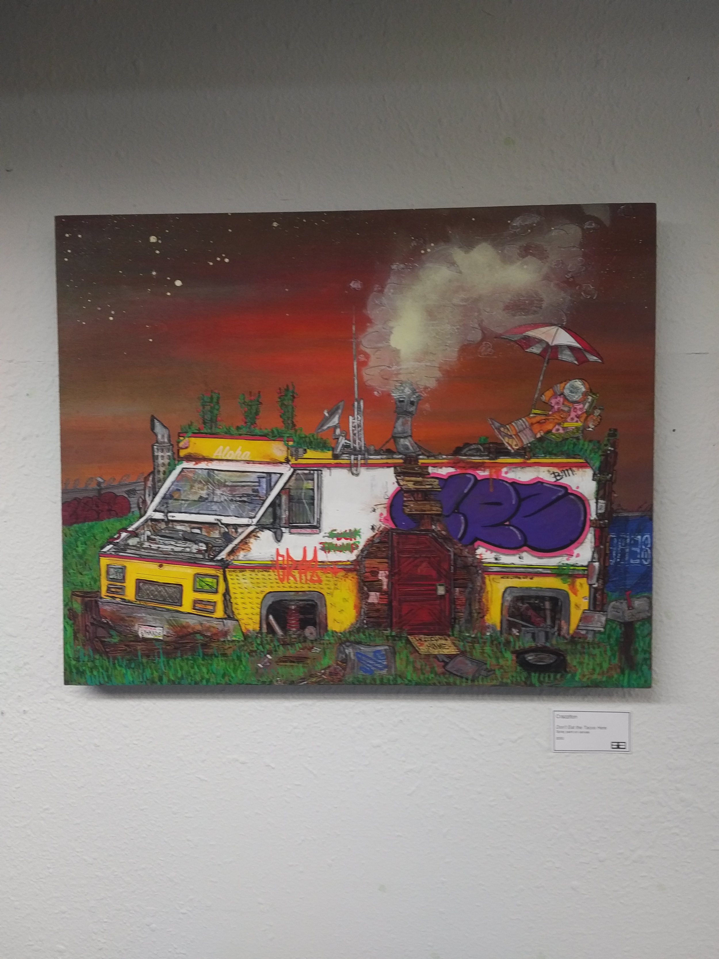 Perry Porter aka Perry Paints recently was involved in the Dozer Warehouse art emporium event in the Beacon neighborhood of Seattle. They converted a very spacious warehouse space into one very large winding and twirling canvas. 70 artists and multiple pieces from each artist. It was like nothing any of us had ever seen. There were painting in every medium, tons of complex graffiti - so much so it was difficult to intake all the detail surrounding us as we walked in and out of rooms up and down stairs and traced long hallways attempting to see every piece. There were handmade cages lofts and areas that seemed almost like crawl spaces. We did two laps around the space as it became a warehouse on fire around the midnight hour when all the cool kids showed up. The first lap was a breeze and honestly a little overwhelming, the second lap included standing in line for 15 mins to get back inside and was far more focused, the goal was to get photos of pieces didn't get the first lap because we were too in awe of what the next room held. There was also a raffle we were hoping to win on the way out but we left empty handed. Before our exit and before the live performances of the evening we did get to see Dozer himself and hear him gives thanks and praise to all the artists faces that filled the space. For a one night only event it could not have been more impressive and the quality of artists were breathtaking. One more shout out to Perry for being involved in so many great art events and keeping us in the loop. One time for Izzy too her piece was fye.